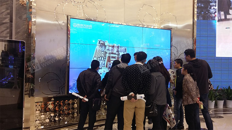參觀者正在操作拼接屏上的電子樓書,電子樓書包含3D項(xiàng)目漫游,360戶型鳥瞰,720度樣板間漫游等。