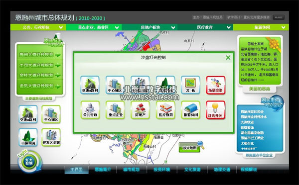 軟件可控制沙盤燈光,搖頭燈,渲染燈,并且可以查看到城市介紹,招商流程,規(guī)劃現(xiàn)狀和未來規(guī)劃,旅游信息,地理交通信息,視頻和解說詞等等非常詳細(xì)強(qiáng)大的功能展示。