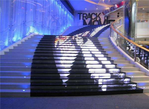 深圳益田假日廣場(chǎng)影院的樓梯屏由銳拓建造,采用高強(qiáng)度的防滑松脂材料做表面,以壓鑄鋁做支持,保證了承重壓力,是國內(nèi)較早的樓梯屏之一。通向影院的每一級(jí)樓梯都安裝了LED顯示屏,模擬紅地毯拾階而上的效果,整體構(gòu)成絢麗的視頻畫面。