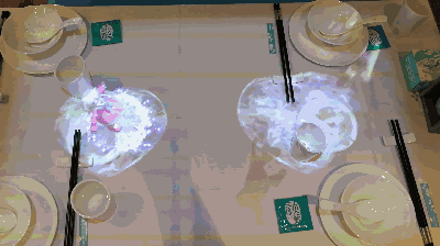 TRF AR互動餐桌系統(tǒng),除了提供iPad點餐結(jié)賬功能之外,還可通過投影機(jī)在AR互動餐桌上投射裸眼3D畫面,高清的虛擬動畫結(jié)合實體的餐桌餐布,制造出虛實結(jié)合的效果;硬妥老到y(tǒng)支持裸眼3D技術(shù),也可升級為3D全息投影,實際效果則更加逼真。