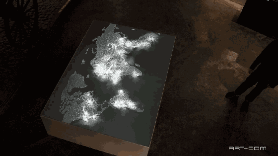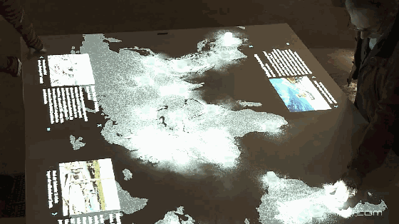 德國(guó)鹽業(yè)博物館展示了一件名為Salt Worldwide的投影交互裝置,幫助參觀者了解鹽的歷史。裝置上共有34個(gè)交互點(diǎn),當(dāng)你觸摸時(shí),散落的鹽粒就會(huì)聚集,接著彈出相關(guān)的介紹頁(yè)。