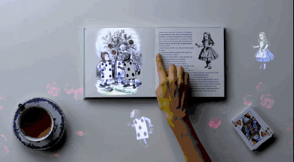 索尼未來(lái)實(shí)驗(yàn)室“Future Lab”將《愛(ài)麗絲夢(mèng)游仙境》打造成一本可互動(dòng)性故事書。翻開(kāi)書本,用戶可以拖動(dòng)故事里的紙牌人和小愛(ài)麗絲;當(dāng)用戶用手指劃過(guò)書中某個(gè)句子時(shí),它會(huì)立即放大出現(xiàn)在桌子上;在書旁放上物品,周邊環(huán)境也會(huì)隨之發(fā)生改變。
