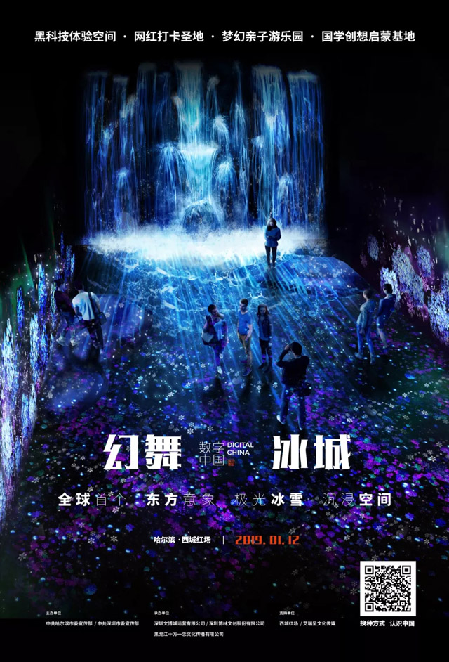 “肆庫(kù)數(shù)字中國(guó)”首站將走進(jìn)滿載異域風(fēng)情、中俄文化交誼深厚的冰雪之城哈爾濱,以“數(shù)字中國(guó)·幻舞冰城”為主題建館紅博·西城紅場(chǎng),于本月12日正式開館!盎梦璞恰睂⒅袊(guó)之北極具地域文化特色的冰雪、極光、丁香花等元素融入到中華傳統(tǒng)文化的東方語(yǔ)境中,以酷炫的黑科技再現(xiàn)奇特瑰麗的東方意象,以夢(mèng)幻般的造景手法再造一個(gè)浪漫唯美的哈爾濱。