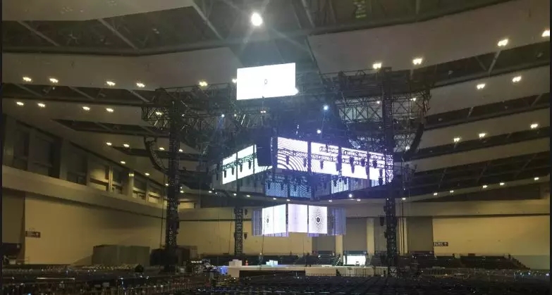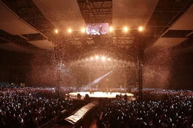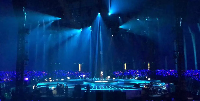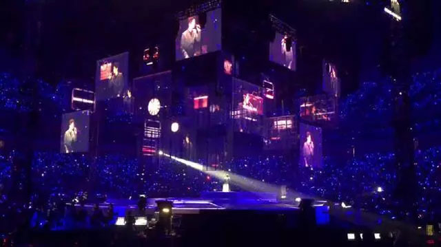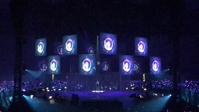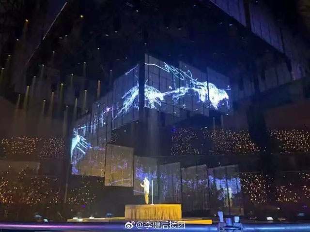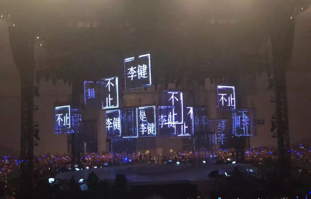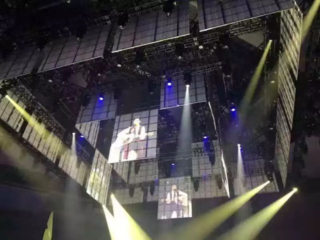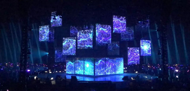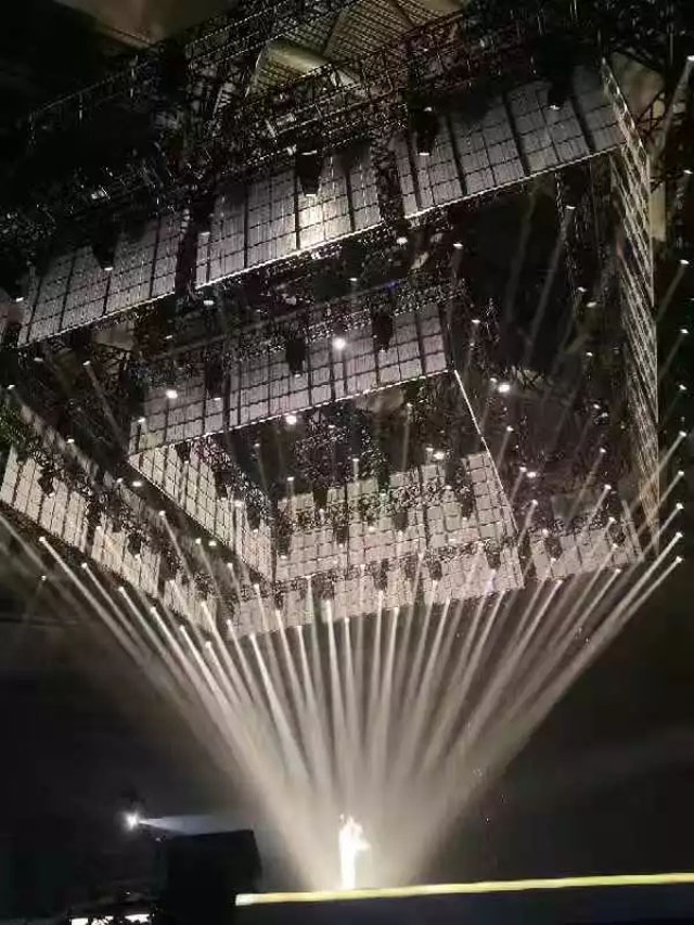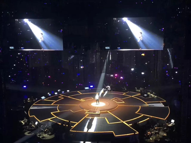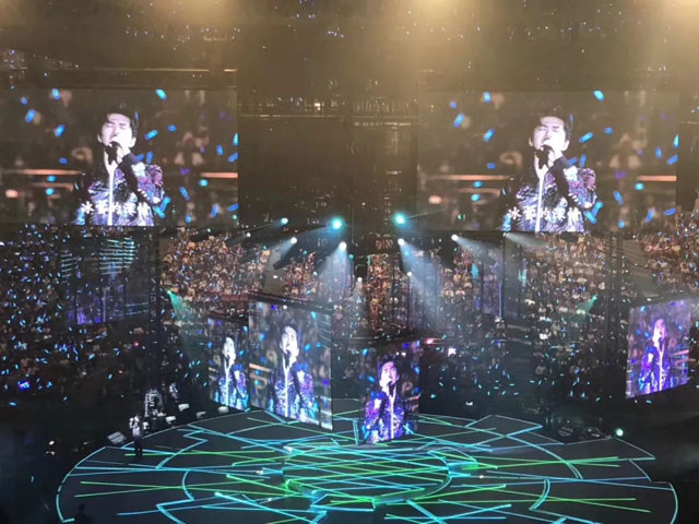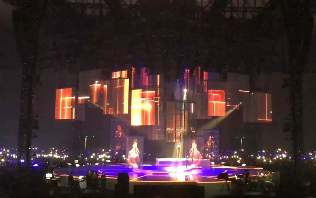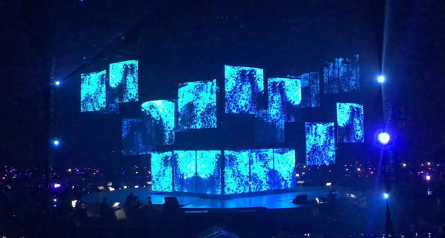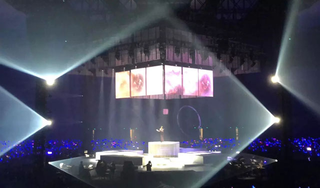 舞臺(tái)中心懸掛著2圈立方形數(shù)控透明屏幕,配合4組數(shù)控升降燈光系統(tǒng),令四面臺(tái)整體似一件藝術(shù)品。視覺(jué)聽覺(jué)完美結(jié)合,讓歌迷沉浸其中。