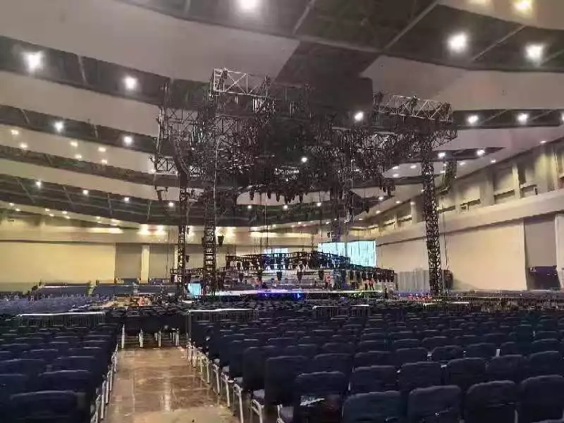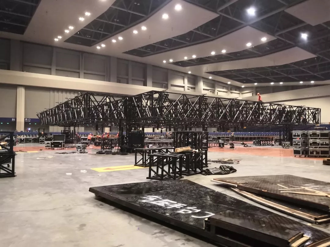 演唱會(huì)結(jié)構(gòu)屋頂采取油壓立柱升降安裝方式,立柱為800x800;橫梁是1.8米高,寬800的猛鋼大梁,跨度20米時(shí)每條的承載力超過(guò)20噸。屋頂?shù)跹b完后重載40噸后中心點(diǎn)的下擾為20mm;所有的接頭為線切割加工。間隙只有20絲(0.2mm)做到高精度,高安全。