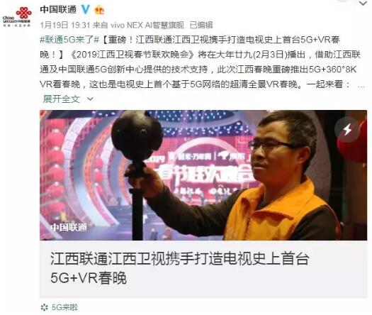 1月19日消息,中國聯(lián)通官方宣布,2019江西衛(wèi)視春節(jié)聯(lián)歡晚會(2月3日播出)重磅推出5G+360°8K VR看春晚,這是電視史上首個基于5G網(wǎng)絡(luò)的超清全景VR春晚。