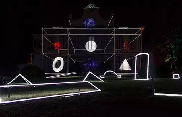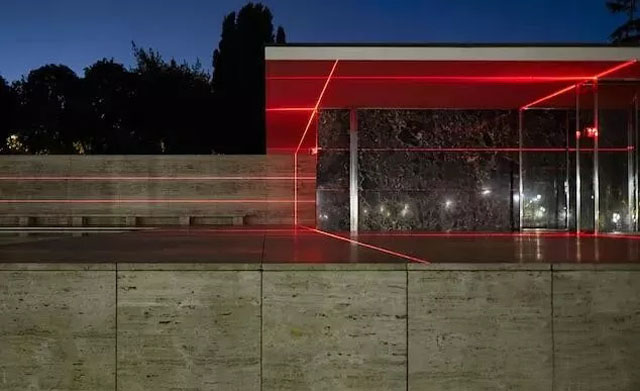 在巴塞羅那德國館內設置的“燈光幾何”基于建筑的特點,在建筑上把紅色激光投射成了大理石原本組合的網格狀方式。由于光可以透過玻璃,建筑的邊界因此有了進一步擴展,達成了另一種層面的“流動空間”。