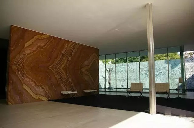在第一次世界大戰(zhàn)之后,德國在 1924 年實施了道威斯計劃,經濟得到復蘇。對 1929 年世博會德國館的設計,建筑師為了讓它達到“向新的時代發(fā)出呼喚”的效果,讓場館擁有了“自由平面”和“流動空間”的特點。它結構簡單,充分體現了建筑師在 1928 年提出的“少即是多”的原則、大理石構成了規(guī)整的網格外觀;同時,大理石的墻壁和地板從內部延伸出來,又使建筑的內外界線變得模糊。