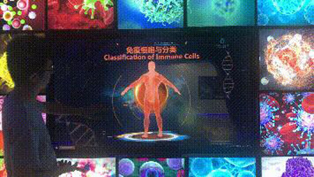 免疫細胞技術隱藏在一個神秘的隧道中,這里營造出讓人有種想要探索的神秘感,總共設計了328個圖文燈箱和5塊觸摸屏組成時光隧道陣列,豐富炫目的人體免疫細胞和細菌細胞以及病毒的圖文燈箱,令人嘆為觀止,原來我們的體內還蘊藏著如此綺麗的微生物世界。