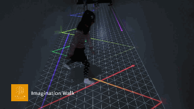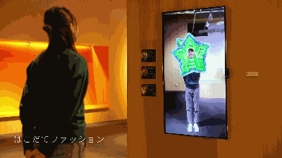 通過AR與人體捕捉技術(shù),會(huì)將路過的人顯現(xiàn)在畫面當(dāng)中,留下軌跡以及將人扭曲變形等。