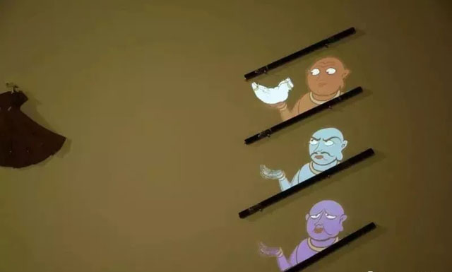 館內(nèi)二樓不得不看的投影互動,利用虛擬圖像與實物展品互動的軌道鏡技術(shù),輕松幽默地為觀眾展現(xiàn)三個藥叉追趕“化生童子”的故事。