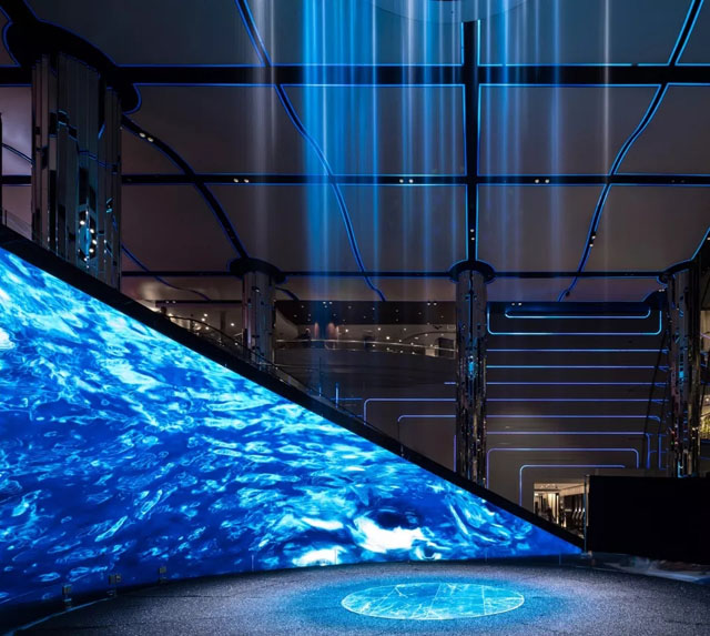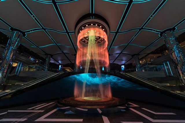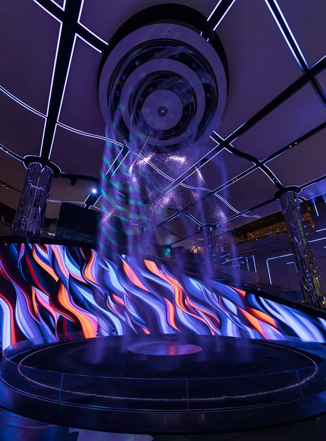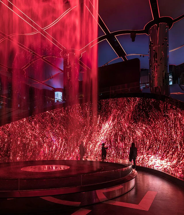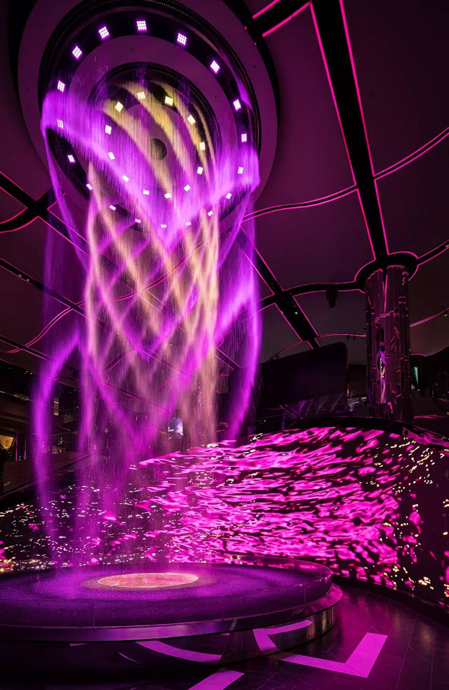 變化的光線圖像作為數(shù)字畫布的延伸,流動在天花板、墻壁以及空間中的水景當中,將畫布上的內(nèi)容擴展至整個兩層高的大廳空間。13米高的圓柱形裝置能夠通過編程來呈現(xiàn)不同造型的瀑布,為整個空間賦予一種由光線、鐳射與投影帶來的優(yōu)雅與動感。