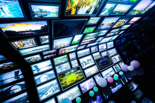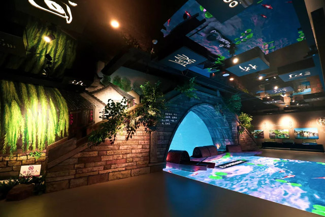 在“運(yùn)河流淌過的江南古鎮(zhèn)”展區(qū),大家會發(fā)現(xiàn)一個(gè)融合詩情畫意與現(xiàn)代科技交相輝映的新奇好玩之處。該展區(qū)地面安裝有一幅巨大的LED顯示屏,當(dāng)人從上面經(jīng)過,顯示屏?xí)c人產(chǎn)生互動體驗(yàn)。