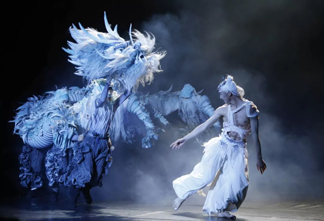 舞臺表演方式多采用大型多人群舞,配合大型王船道具及多重投影等特效,演繹原生態(tài)的海島生活場景,打造沉浸式的體驗觀感,融合藝術(shù)與科技、傳統(tǒng)與現(xiàn)代,正是楊麗萍藝術(shù)追求的“新東方美學(xué)”。