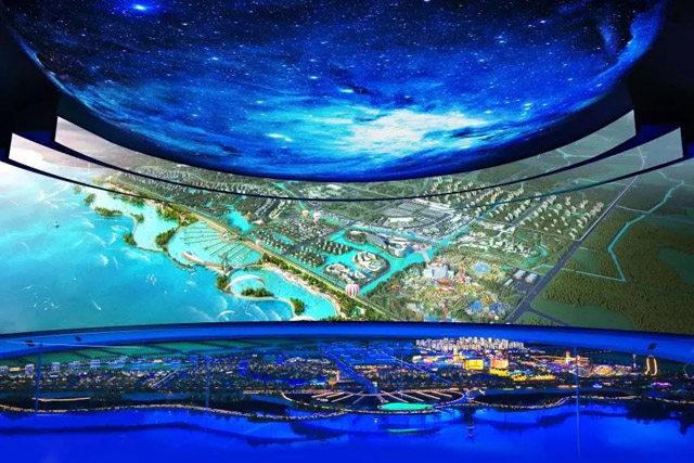 全新升級改造后,規(guī)劃館沙盤區(qū)LED面積增加超過3倍,沙盤大屏由原來的118度升級為180度,橫向兩側各增加9米,形成總長約50米的戶型屏幕,增加球幕環(huán)幕的銜接,頂幕畫面呈現方式升級為LED,整體營造出最為震撼的視覺效果。