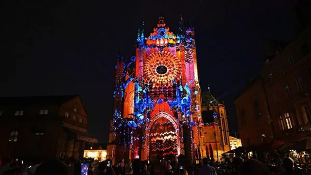 圣-埃蒂安大教堂是一座極其漂亮的哥特式建筑,大面積的彩色玻璃幕窗是它的特色,也成為投影時的完美介質。