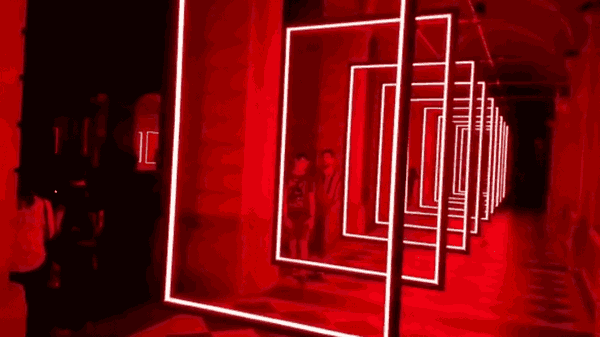 Olivier Ratsi 在修道院的回廊里用紅色長方形燈制造了一條叫“Frame Perspective”的通道,參觀者每走到一處,就會點亮那里的燈光。