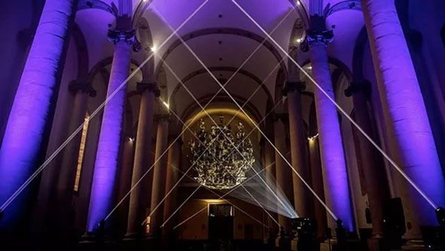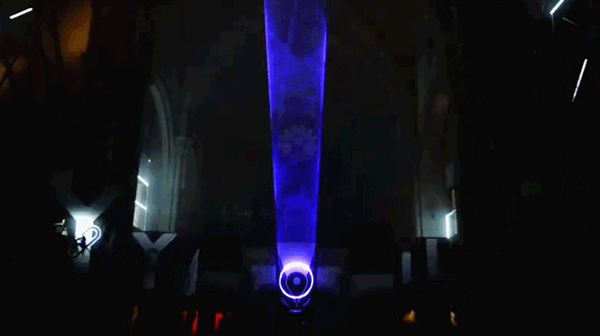 一個可以射出250道光柱的六邊形裝置被安放在教堂的前端,射出強烈的白色光線,教堂兩側柱子上也裝有長條形的led燈柱,使光源不那么單調。大大小小的光線會隨著音樂而改變,持續(xù)約15分鐘,做一場登月之夢。