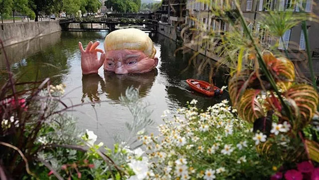 莫澤爾河上,“川普”半淹在水里,擺出“OK”的手勢,這是法國藝術家兼建筑師雅克-塞勒特(Jacques Rival)的作品《一切都好》,表達藝術家對特朗普否認“全球變暖”的感受。