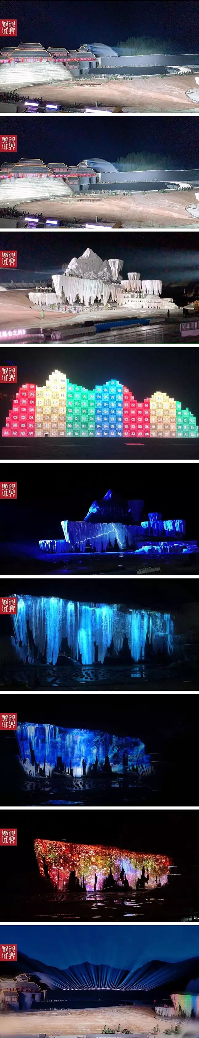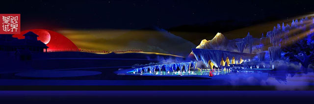 水西溝冰雪小鎮(zhèn)打造2萬平方米的宏大實(shí)景舞臺(tái)展現(xiàn)華夏史詩,將南山實(shí)景與聲、光、電及水景相融,把西周莊嚴(yán)的殿宇與雪域幻麗的仙境都聚落在南山腳下。