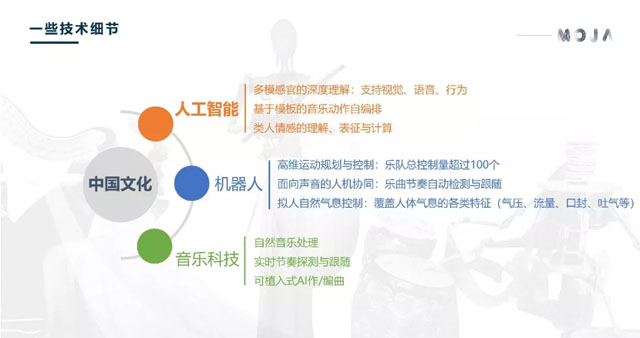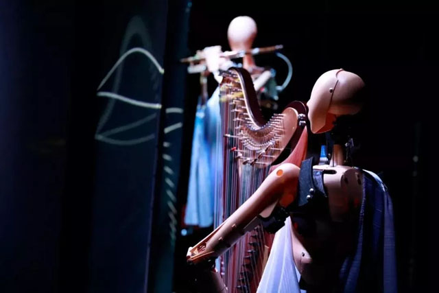 中國的機(jī)器人藝術(shù)尚處于起步階段,《墨甲幻音》這一機(jī)器人舞臺劇,首次將機(jī)器人演奏、中國民族器樂、多媒體舞臺戲劇等技術(shù)與文化元素結(jié)合在一起。不僅在價值層面實(shí)現(xiàn)了中國風(fēng)格原創(chuàng),還在技術(shù)層面取得了人工智能、機(jī)器人、音樂科技、造型藝術(shù)的突破性進(jìn)展,展現(xiàn)了科技與人文、藝術(shù)之間看似對立、實(shí)則交融的親密關(guān)系。
