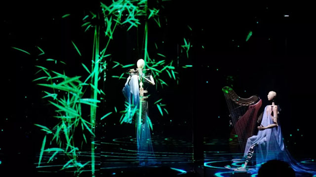 “墨甲”機(jī)器人“樂師”衣袂飄飄,各具風(fēng)姿。伴隨著彈奏而出的悠揚(yáng)曲調(diào),荷花、竹林、小鹿等動態(tài)形象紛紛呈現(xiàn)眼前。他們演奏的樂曲全部是原創(chuàng)音樂,也都是由作曲家根據(jù)機(jī)器人演奏的特點(diǎn)為樂隊量身打造的。