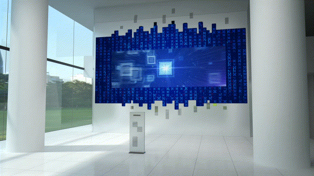 智慧大屏系統(tǒng)由15塊等離子顯示器拼接屏和外部鋸齒狀的LED屏幕組合而成,內(nèi)部拼接屏分辨率接近8K,外部異形拼接0.2毫米LED實(shí)現(xiàn),分辨率在4K水平。