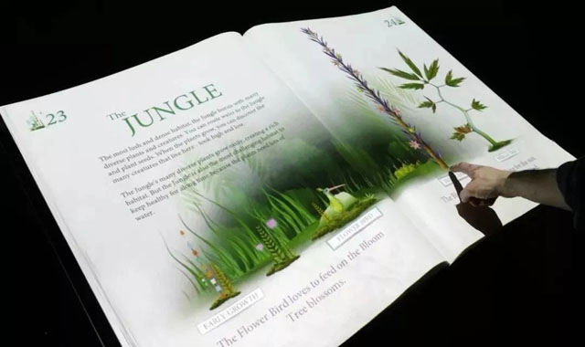 Living Library 使用兩個攝像頭和一個激光光源投影儀,水的循環(huán),植物的生長,山谷沙漠地貌……書頁上的動畫講述著生態(tài)系統(tǒng)的一幕幕場景。用手觸碰書頁,有的動物會暫停吃草看著你,點(diǎn)擊樹上的小鳥,它們會受到驚嚇......風(fēng)吹草動,流水潺潺。