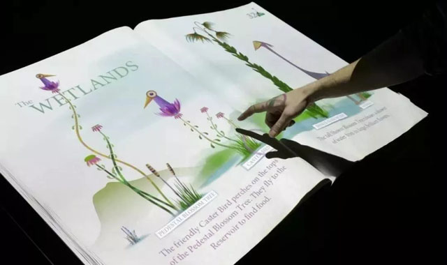 它創(chuàng)造出一種動態(tài)的、生動的體驗(yàn),使得裝置既有觸感,又栩栩如生。安裝在投影書上方的深度相機(jī)可以跟蹤訪問者的手,游客只需觸摸頁面就可以觸發(fā)動畫。
