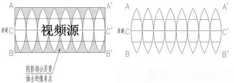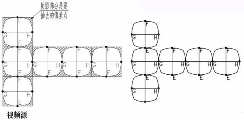 需要說(shuō)明的是:視頻源是平面的,而播放媒介(球形屏)是球面的,因此平面的視頻源需要均勻壓縮與抽點(diǎn)才能完成在球形屏上播放,參見(jiàn)圖三中陰影部分是必須抽去的,經(jīng)過(guò)計(jì)算這部分占比約15.2%左右,也就是圖像畸變也為15.2%左右。
