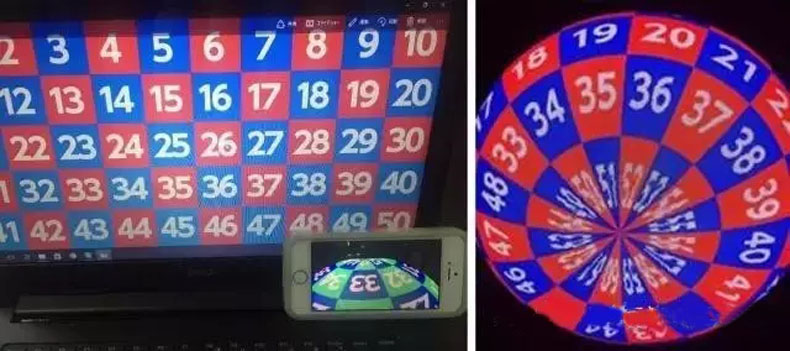 西瓜皮球屏的圖像源只能來(lái)自于一個(gè)視頻源,其播放模式示意圖見(jiàn)圖六,圖中的陰影部分像素是必須抽去,經(jīng)過(guò)計(jì)算約占比約36.4%左右,也就是圖像畸變約為36.4%左右,可以看出,它的圖像畸變主要產(chǎn)生在南北極附近,實(shí)際顯示效果參見(jiàn)圖七、圖八。對(duì)應(yīng)圖七的左邊是電腦上LED播放器的圖像源的照片,右邊是西瓜皮球屏播放的照片,可看出靠近兩極區(qū)域圖像中的數(shù)字幾乎已經(jīng)辨認(rèn)不出。西瓜皮球屏的成像與播放在本質(zhì)上是平面圖像在三維球面上播放,產(chǎn)生36%左右的圖像畸變是必然的,兩極區(qū)域顯示不清也是必然的,難以適應(yīng)俯視或仰視的應(yīng)用場(chǎng)景。