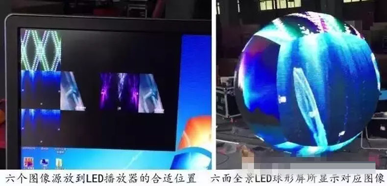 請(qǐng)參見(jiàn)圖三圖四。因?yàn)榻^大多數(shù)普通圖像源都是平面的、中規(guī)中矩的矩形,設(shè)計(jì)者只須將需要播放的六個(gè)圖像源(圖四左圖)放到LED播放器的合適位置并播放它即可(圖四右圖)。通過(guò)簡(jiǎn)單的設(shè)置使得它們分別對(duì)應(yīng)在球形屏上的上、下、前、后、左、右六個(gè)位置播放。