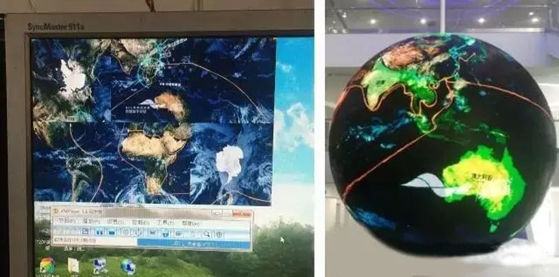 當(dāng)然這6個(gè)圖像源在全景球屏上可以無(wú)縫拼接播放,例如,參見(jiàn)圖5,將6張地球儀圖片(圖五左圖)無(wú)縫拼接后在全景球屏上播放(圖五右圖)。由于全景球屏結(jié)構(gòu)上沒(méi)有南北極概念,因此不存在類(lèi)似西瓜皮球屏南北極像素?fù)p失嚴(yán)重的情況。