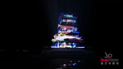 以引云閣為代表的傳統(tǒng)結(jié)構(gòu)歷史建筑,成倍增加效果落地的難度,不僅要確保投影與樓體完美吻合,亦要保證畫面的流暢與美觀。本次現(xiàn)場(chǎng)使用多臺(tái)超高流明的投影機(jī)從不同區(qū)域兩倍疊加,結(jié)合多通道的無縫融合,確保投影的高質(zhì)量。并引入“3D視效”“顏色亮麗動(dòng)效”、“人物光圈”等令人驚艷的創(chuàng)新技術(shù),為古建注入新維度,美輪美奐的詮釋大縱湖千年滄桑。
