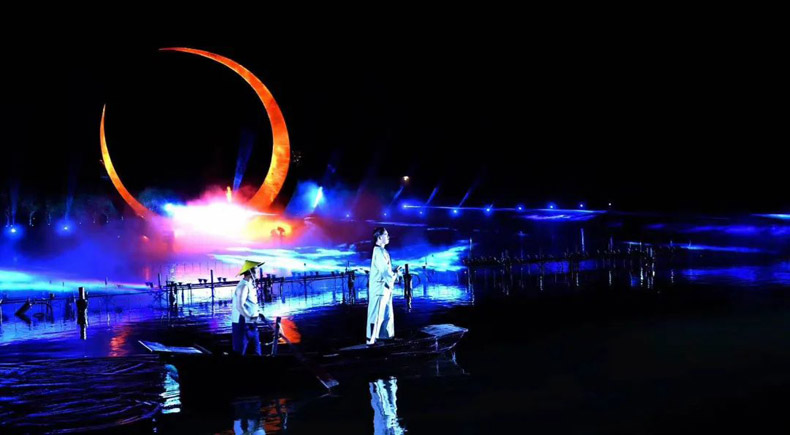 以鹽城最富盛名的平湖秋月之景為基,以傳唱幾代人的紅色經(jīng)典愛情故事為魂,通過直徑12米的“平湖秋月”地標(biāo)景觀裝置配合國(guó)內(nèi)僅見的多層級(jí)實(shí)景秀場(chǎng),融入現(xiàn)代舞美的再制,演繹蕩氣回腸的紅色革命故事,深度詮釋大縱湖新人文符號(hào)。