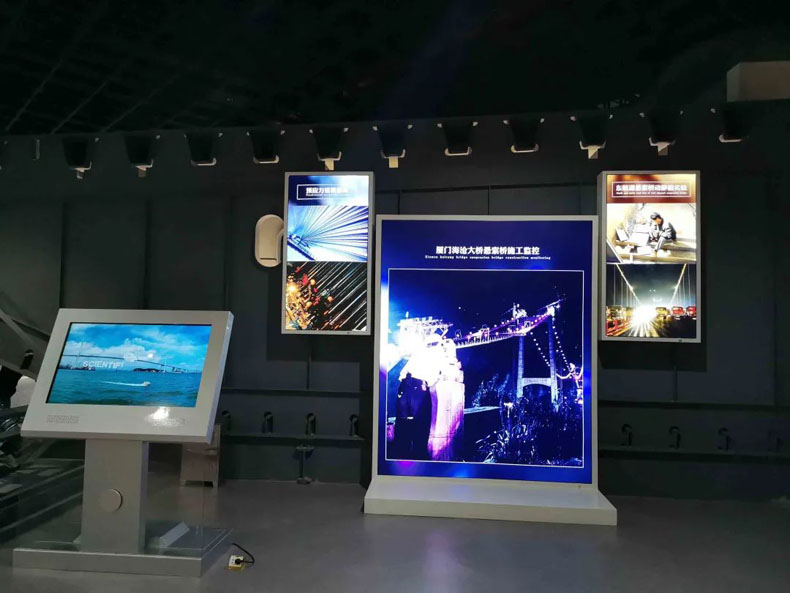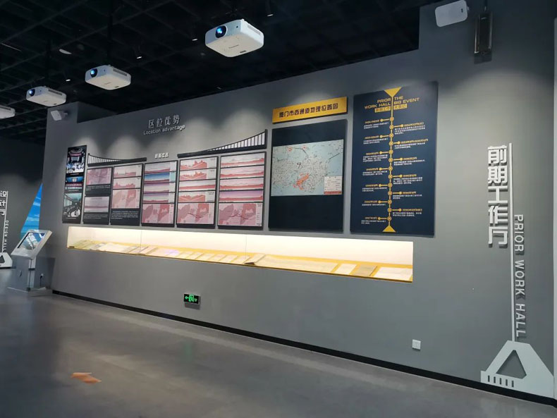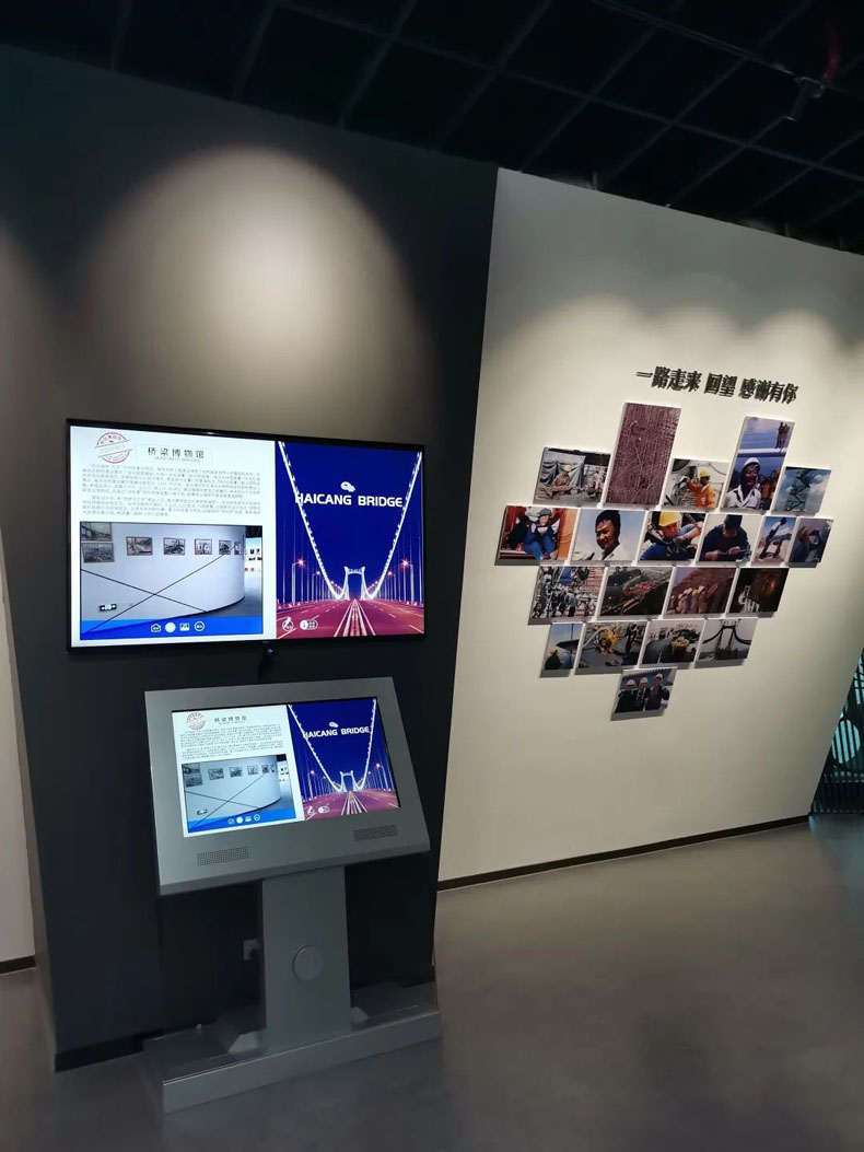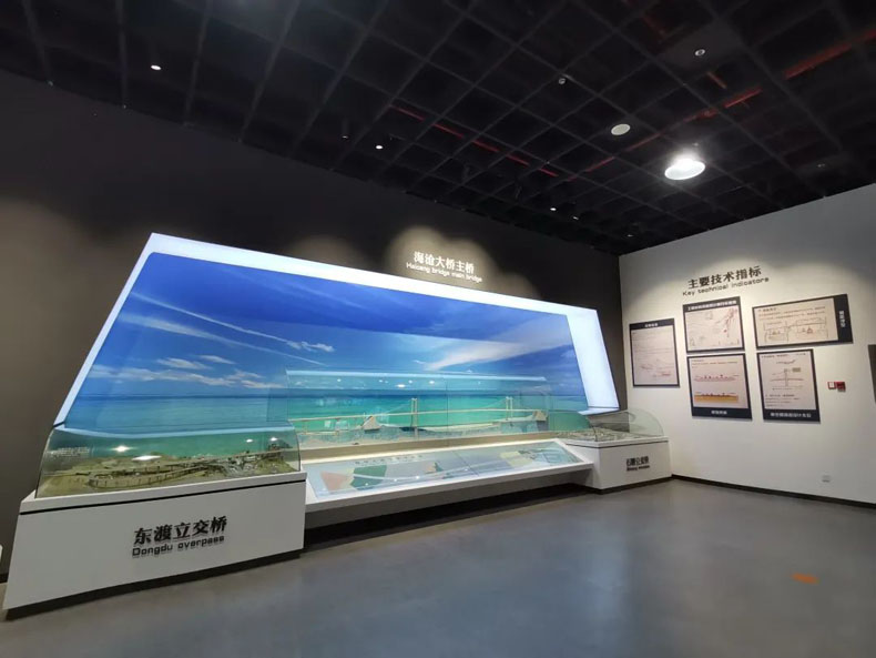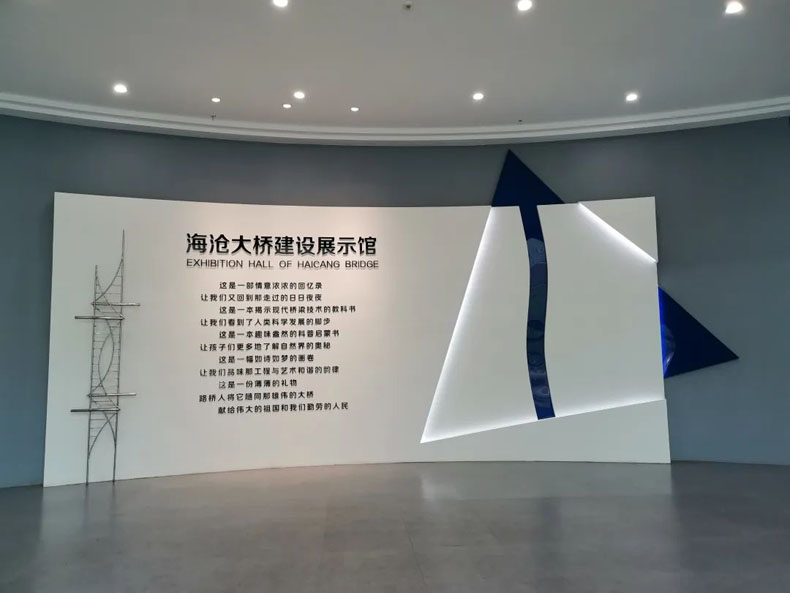 將左右兩側(cè)展面重新做簡(jiǎn)潔飾面設(shè)計(jì),左側(cè)呈現(xiàn)海滄大橋色彩方案,景觀設(shè)計(jì),右側(cè)則是建設(shè)管養(yǎng)展陳相關(guān)內(nèi)容,輔以電子屏動(dòng)態(tài)體驗(yàn)。