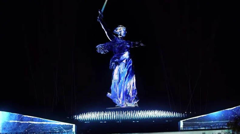 “母親”雕像矗立在伏爾加格勒的馬馬耶夫崗上,高 52 米,右手舉著一把長 33 米的利劍,左手呈現(xiàn)召喚姿勢,昂首挺胸,氣勢恢宏。16 臺亮度為 45,000 流明的 Christie D4K40-RGB 純激光投影機圖像映射到這座 85 米高的雕塑上。D4K40-RGB 配備 Christie TruLife 電子平臺和 Christie RealLaser 照明系統(tǒng),這使得雕像能顯現(xiàn) 90% 以上的 Rec.2020 色域,并呈現(xiàn)出充滿活力、色彩豐富、栩栩如生的圖像。