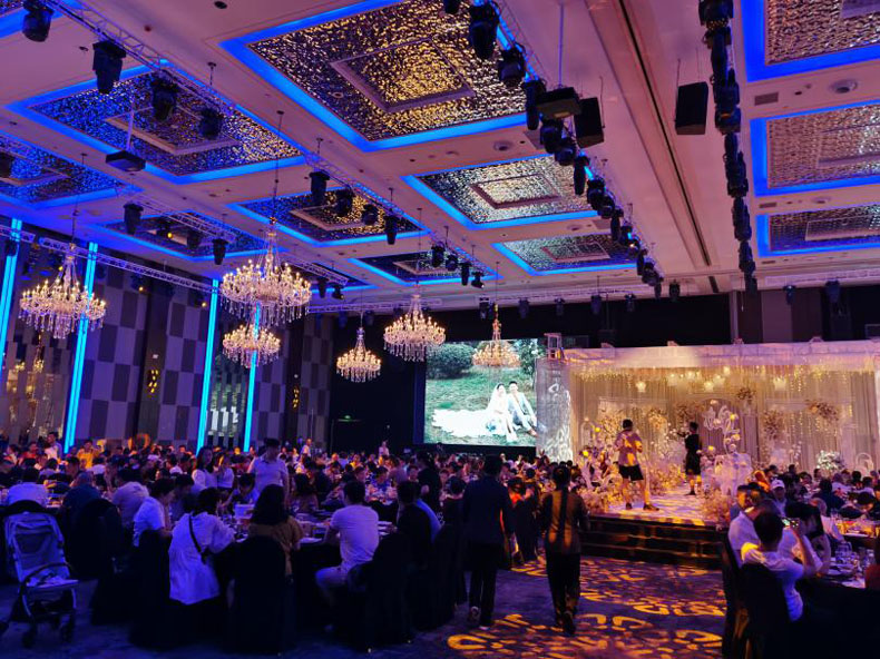 為了打造美輪美奐的婚禮場地,給新人一個滿意的婚禮殿堂,西南某婚慶公司從投影機的品質、亮度、色彩、功能配置以及價格等多方面進行綜合考慮,最終選擇理光激光工程投影機PJ LU10000、PJ LU9090、PJ RL800U及PJ LU5018四款型號,共計26臺設備,應用于多個宴廳和婚慶項目。