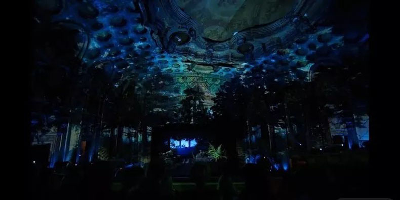 為了設(shè)計一款這樣的沉浸式體驗,Oculus與VTProDesign先是對洛杉磯劇院進行了精密的3D掃描,接著用22個投影儀將16Kx8K分辨率的沉浸式畫面投射在影院的穹頂上,除了投影儀外,還使用16個激光設(shè)備來測繪場地的細節(jié),以及制造立體的光線和效果,甚至還會投射在觀眾群中,產(chǎn)生互動。