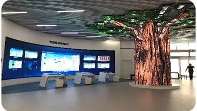 該屏是為某智慧中心顯示系統(tǒng)打造的異形屏,其整體的拼接分為兩部分:樹葉(5.44平方米)+樹干(25.74平方米),遠看赫然是一顆直沖房頂的大樹,近看才知其中構造。
