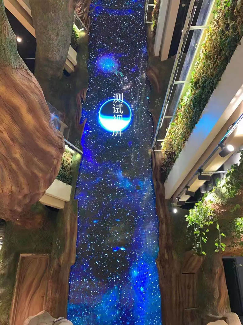 該屏為?低暈楹贾菽成虉龃蛟斓腜4水幕屏,整體比例為3(寬)*14(高),遠看有銀河落九天的美感,近看才能發(fā)現原來銀河竟是由一個一個像素點組合而成,讓人不禁感嘆其顯示效果的靈動逼真。