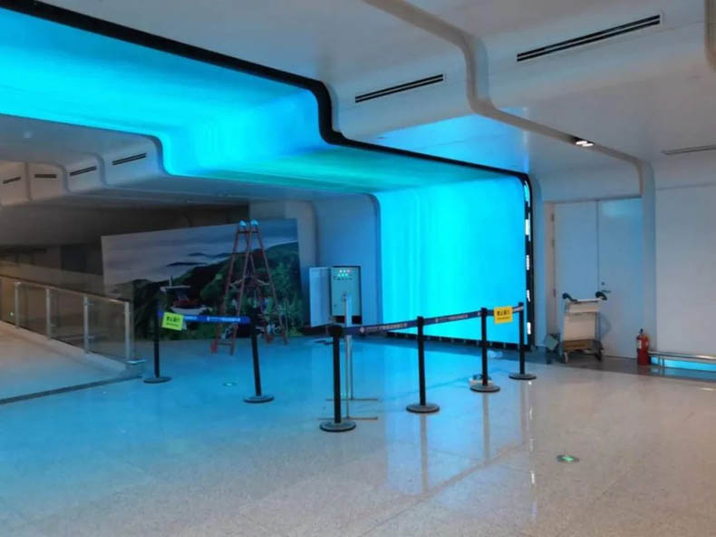 該屏為寧夏某機場P2.0 74㎡LED異形屏項目案例,整體呈階梯形狀,完美與機場墻面融合,配合顯示畫面使乘客在待機時就感受到徜徉天空之感。