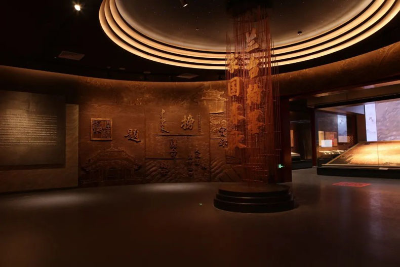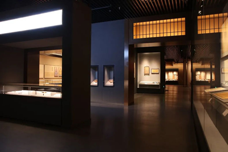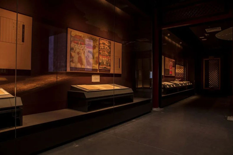 在空間中,涉及宮廷部分,采用皇家建筑中的一些元素,如:文淵閣書柜、窗格、頂部鑿井、匾額等貫穿展覽空間,使得每個(gè)區(qū)域即獨(dú)立又富有聯(lián)系。通過頂部和地面營造基礎(chǔ)色調(diào),皇家顏色貫穿整個(gè)展覽,保障各個(gè)部分整體協(xié)調(diào)統(tǒng)一。每個(gè)部分顏色區(qū)分通過小面積的標(biāo)題版以及展板進(jìn)行區(qū)分,使得空間既協(xié)調(diào)又有區(qū)分。