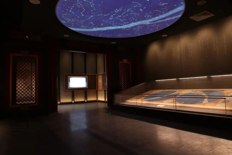 《赤道南北兩總星圖》由8幅卷軸拼接而成(202cm*452cm)反映了明代學(xué)者對天文的認(rèn)知。此空間由實(shí)物、穹幕投影、展品拓展信息三部分組成。展區(qū)整體營造深邃空間感,頂部投影重點(diǎn)表現(xiàn)北星圖及南星圖星宿。仰望蒼穹,置身星空之下,為觀眾帶來沉浸式觀展體驗(yàn)。