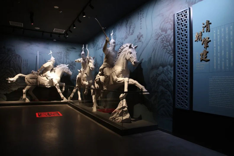 由于建筑結(jié)構(gòu)將展覽劃分為兩個(gè)區(qū)域,在清朝展區(qū)前增設(shè)一個(gè)小序廳作為過渡空間,于白山黑水背景中,凸顯弓馬騎射雕塑的視覺張力,并在內(nèi)容層面銜接第二部分清朝肇建。
