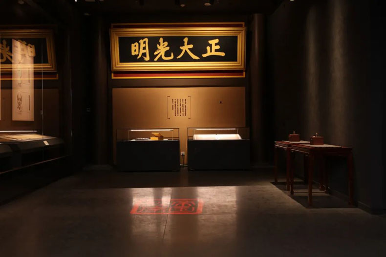 道光秘密立儲諭旨并匣重點(diǎn)展品與正大光明匾上下呼應(yīng),定向音箱講解清朝秘密立儲制度。右側(cè)陳列嘉慶帝做皇子時(shí)書石鼓文檔案。