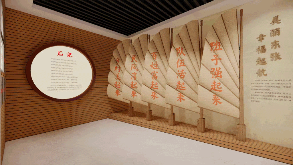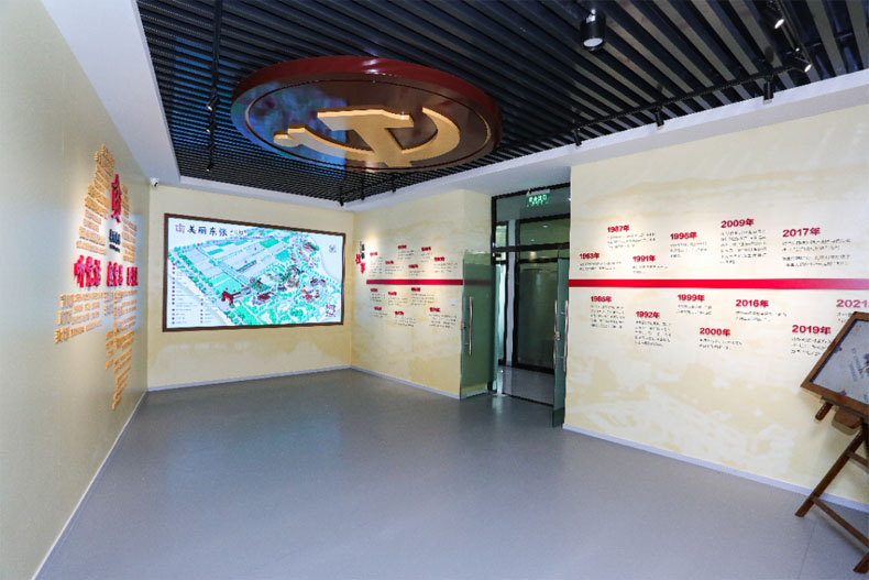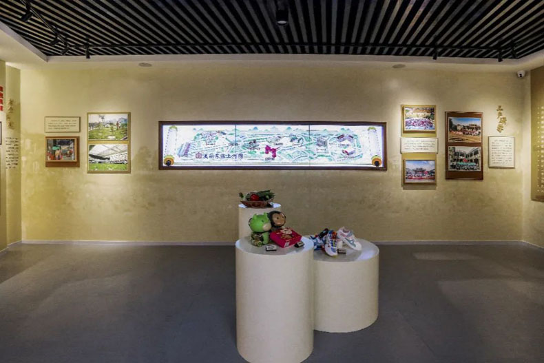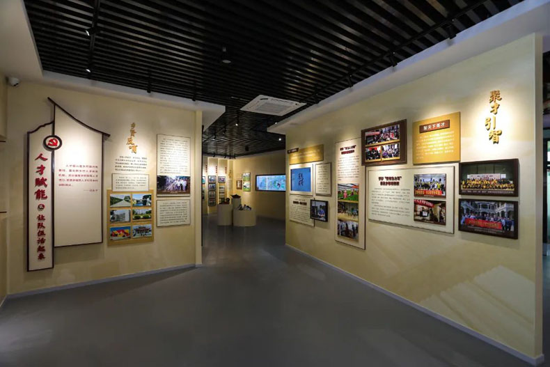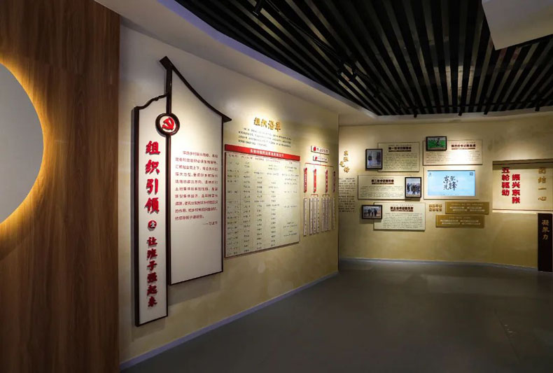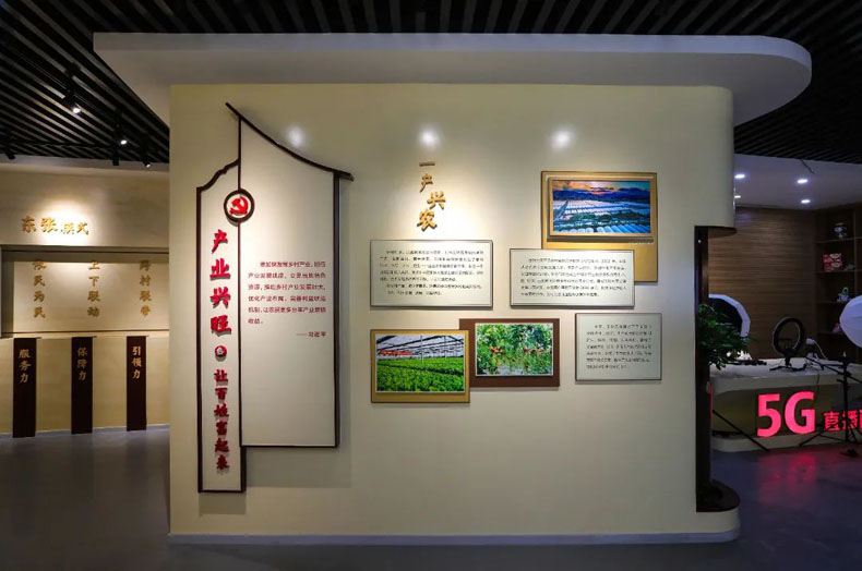 該館以鄉(xiāng)村振興為主題,位于界山鎮(zhèn)東張村“黨建+”鄰里中心二樓,建筑面積250平方米。全館通過“黨建+”模式展現(xiàn)了界山鎮(zhèn)“組織引領(lǐng)、人才賦能、產(chǎn)業(yè)興旺、文化賡續(xù)、生態(tài)宜居”五大振興維度,以專業(yè)而縝密的敘事邏輯講述了“黨建引領(lǐng)鄉(xiāng)村振興”的砥礪故事。